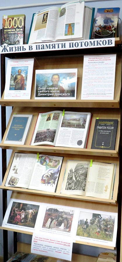 К памятной дате в Центральной библиотеке подготовлена книжная выставка-репродукция, на которой представлены издания раскрывающие его многогранный образ, и литературу где подробно освещена Куликовская битва. А также экспозиция, сопровождающая картинами художников XIX и XX веков.