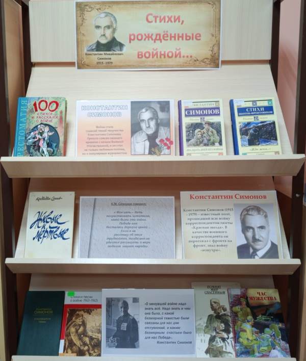 В библиотеке села Пудино к юбилею поэта К.М. Симонова оформлена книжная выставка. В экспозиции представлены наиболее известные произведения Константина Симонова, посвященные Великой Отечественной войне: сборники стихотворений "С тобой и без тебя", "Война", "Друзья и враги", а также поэма "Жди меня".